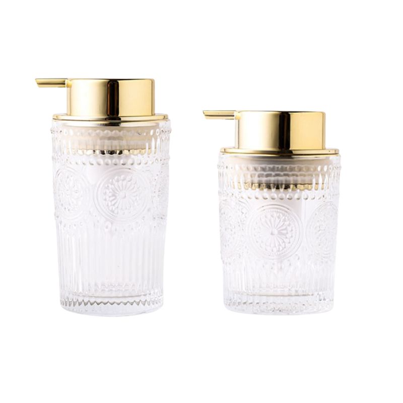 Upptäck vår eleganta Glastvålpump med guldpump och mönster