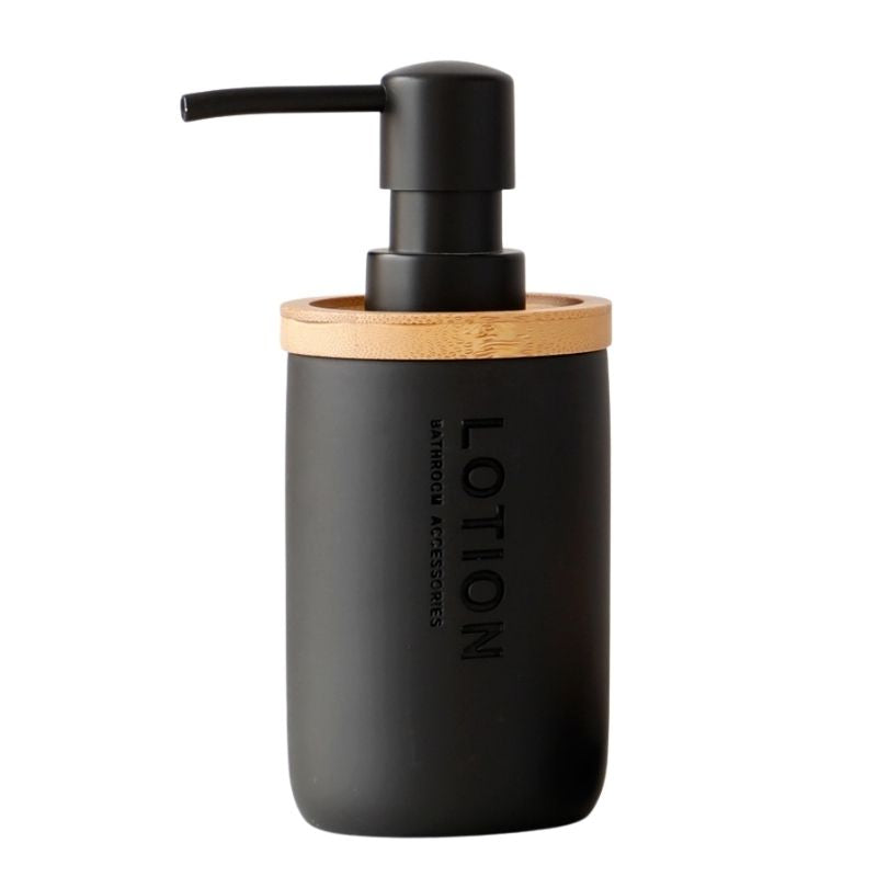 Svart tvålpump med lock i bambu för ett elegant badrum