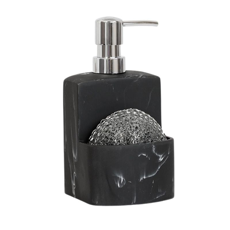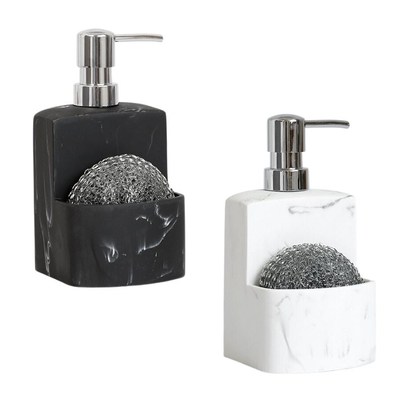 Denna tvålpump med svamphållare för köksbänken är tillverkad i ett slitstarkt material med en vacker marmorerad finish i svart och vitt, vilket ger den en lyxig känsla. Den passar perfekt in i de flesta moderna kök och blir en snygg detalj bredvid diskhon. Svamphållaren är integrerad i tvålpumpens design, vilket gör att din disksvamp eller stålull alltid finns nära till hands, men diskret förvarad. Inga fler blöta svampar som ligger direkt på bänken! Den robusta pumpmekanismen garanterar en smidig dosering av diskmedel eller flytande tvål.